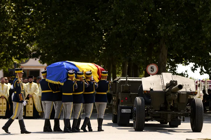 Sicriul cu trupul neinsufletit al fostului presedinte Ion Iliescu este dus pe un afet de tun la Cimitirul Militar Ghencea III din Bucuresti, joi, 7 august 2025. ALEXANDRU DOBRE / MEDIAFAX FOTO