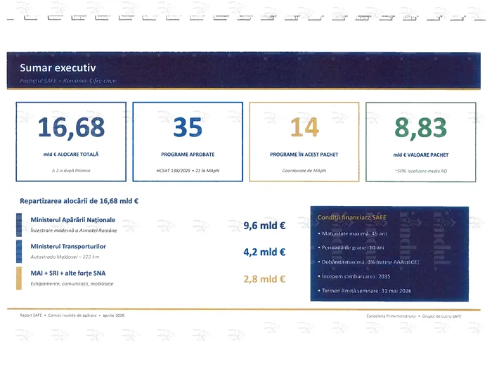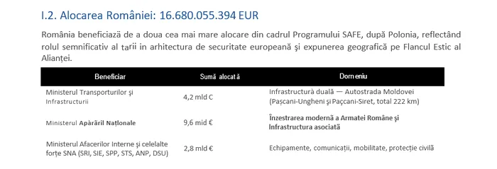 România beneficiază prin Instrumentul european SAFE (Security Action for Europe) de o alocare de 16.680.055.394 euro – a doua cea mai mare alocare după Polonia.