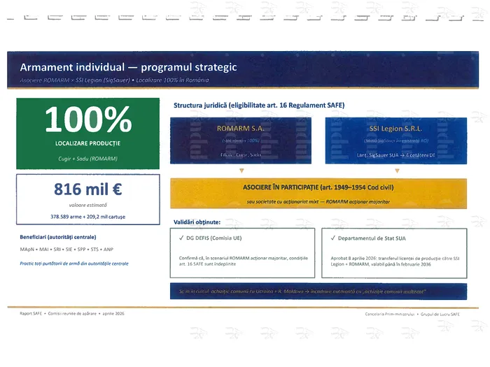Mecanismul juridic: asociere în participație (art. 1949-1954 Cod civil) sau, după caz, societate pe acțiuni Eu capital mixt. Solutta răspunde direct cerințelor de eligibilitate prevăzute la art. 16 din Regulamentul SAFE.