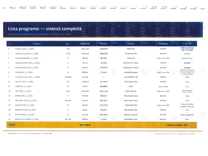 • Așa cum arată raportul obținut de Gândul, suma totală de 16,6 miliarde de euro alocate României cuprinde 35 de programe prin hotărârea CSAT 138/2025. Dintre care 21 de programe revin Ministerului Apărării.