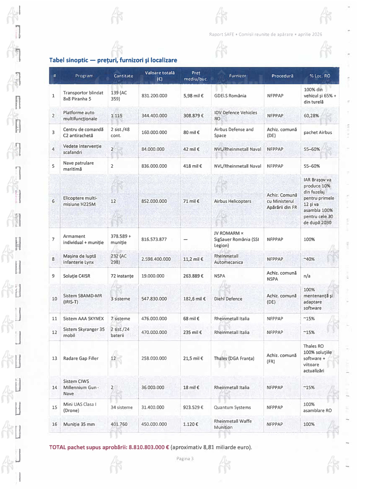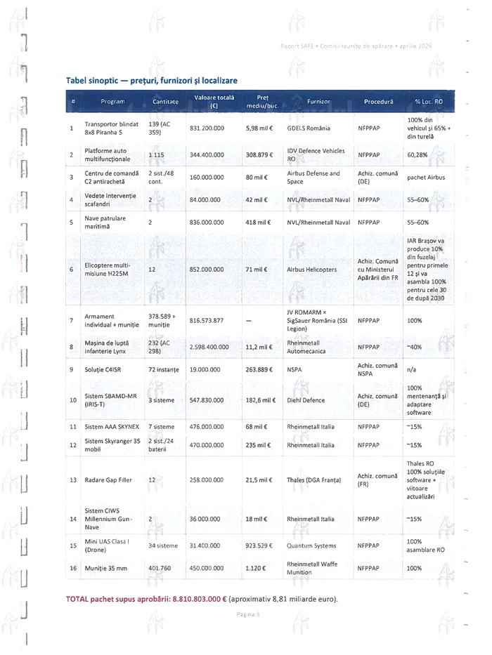 Valoare totală pachet Airbus în Plan SAFE: 1,012 mld €, plus interes pentru un lot suplimentar de 30 elicoptere H225M începând cu 2030 ( 2 rnld €, fina tare națională). Pachet Thales: 258 mii €.
