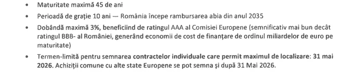 • Prin SAFE, statele membre ale Uniunii Europene pot accesa împrumuturi cu dobânzi avantajoase care pot fi achitate în termen de 45 de ani. Mai trebuie precizat că toate produsele trebuie să fie livrate până în anul 2030.