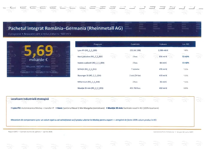 Pachetul include pro8ramele coordonate cu Rheinmetall AG, Diehl Defence și Quantum Systems. Valoarea totală a pachetului Rheinmetall este de 5, 689 miliarde de euro. Cifra e obținută în urma unei negocieri care a redus oferta inițială cu aproximativ 820 milioane euro, se arată în document. Acesta structurează pachetul cu Germania astfel: