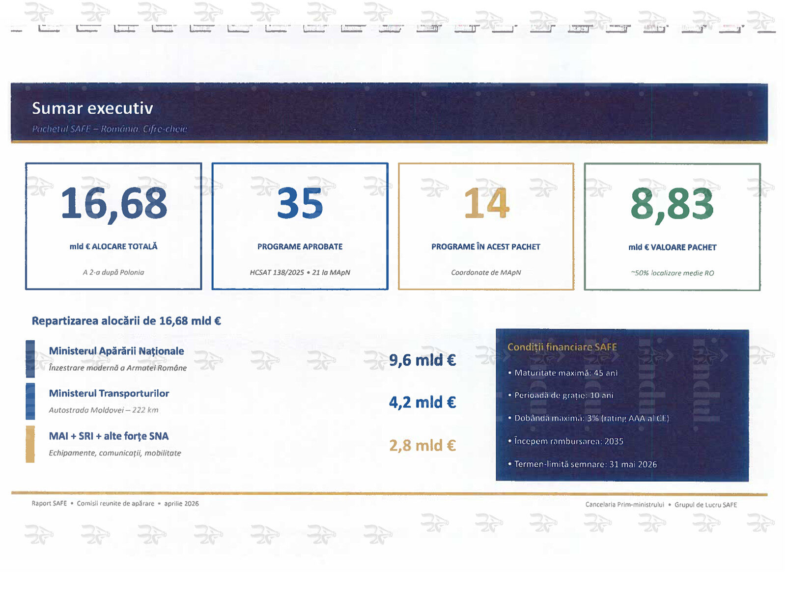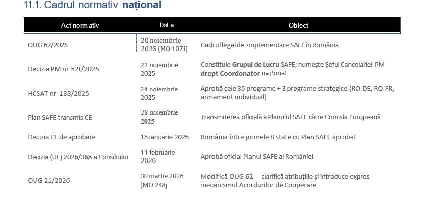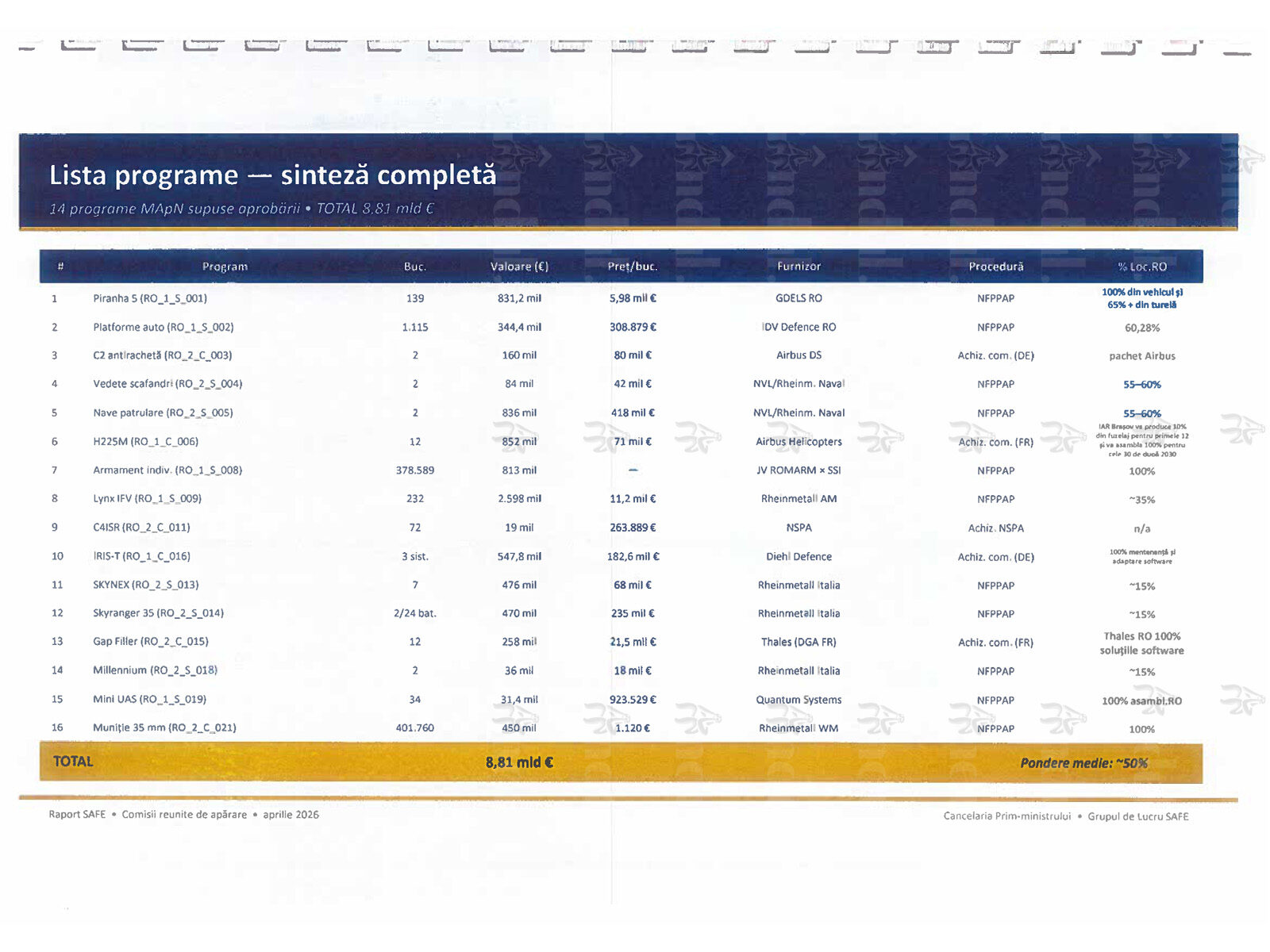 Prin Hotărårea Consiliului Suprem de Apärare a Țärii nr. 138 din 24 noiembrie 2025 au lost aprobate 35 de programe, dintre care Ministerul Apärării Naționale coordonează 21. Prezentul raport supune aprobärii Parlamentului 14 programe coordonate de MApN, însumând o valoare estimată de aproximativ 8,83 miliarde euro.
