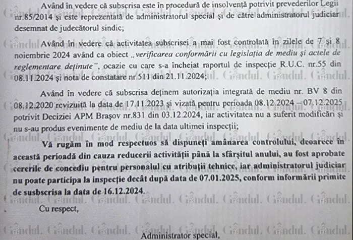 „Vă rugăm respectuos să dispuneți amânarea controlului, deoarece în această perioadă, din cauza reducerii activității până la sfârșitul anului, au fost aprobate cererile de concediu pentru personalul cu atribuții tehnice, iar administratorul judiciar nu poate participa la inspecție decât după data de 07.01.2025, conform informării primite de subscrisa la data de 16.12 2024”, au transmis reprezentanții Viromet către Garda Națională de Mediu, Comisariatul Județean Brașvov în data de 17 decembrie 2024.