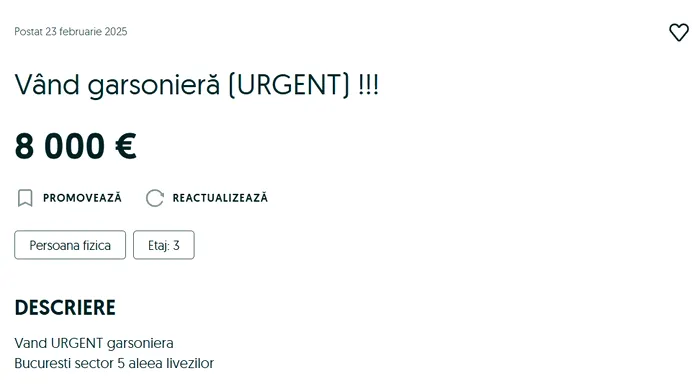 Acesta a precizat că se grăbește și dorește să vândă garsoniera cât mai repede, astfel că este bine să vă grăbiți, dacă vă aflați printre potențialii cumpărători.