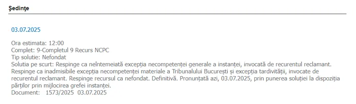 „Tip soluție: Nefondat. Soluția pe scurt: Respinge ca neîntemeiată excepţia necompetenţei generale a instanţei, invocată de recurentul reclamant. Respinge ca inadmisibile excepţia necompetenţei materiale a Tribunalului Bucureşti şi excepţia tardivităţii, invocate de recurentul reclamant. Respinge recursul ca nefondat. Definitivă. Pronunţată azi, 03.07.2025, prin punerea soluţiei la dispoziţia părţilor prin mijlocirea grefei instanţei. Document: 1573/2025 03.07.2025”, au decis magistrații CAB.