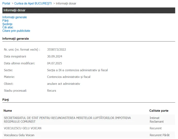 Dosarul a ajuns la CAB în luna septembrie a anului 2024, la Secția a IX-a contencios administrativ și fiscal. Partea „intimat reclamant” a fost Secretariatul de stat pentru recunoașterea meritelor luptătorilor împotriva regimului comunist.