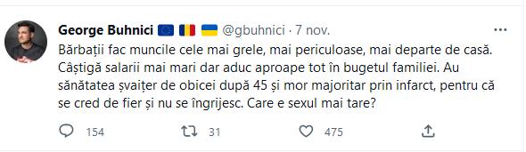 „Bărbații fac muncile cele mai grele, mai periculoase, mai departe de casă. Câștigă salarii mai mari, dar aduc aproape tot în bugetul familiei. Au sănătatea șvaițer de obicei după 45 și mor majoritar prin infarct, pentru că se cred de fier și nu se îngrijesc. Care e sexul mai tare?” a scris Buhnici pe Twitter luni, 7 noiembrie.