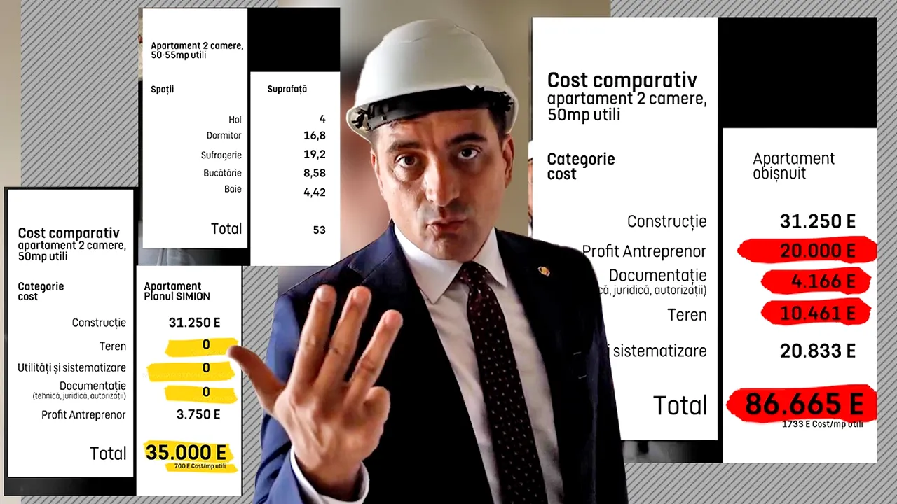 Un apartament cu o suprafață cuprinsă între 50-55 mp poate costa 35 000 de euro, pe piața imobiliară din România, dacă dezvoltatorul nu ar mai adăuga și profitul de până la 200%, ca să-și amortizeze diversele cheltuielile apărute pe parcursul procesului de construcție. La această concluzie a ajuns liderul AUR, George Simion, care a început o demonstrație practică pe o viitoare locuință, la bloc, preluată de la stadiul „la roșu”.
