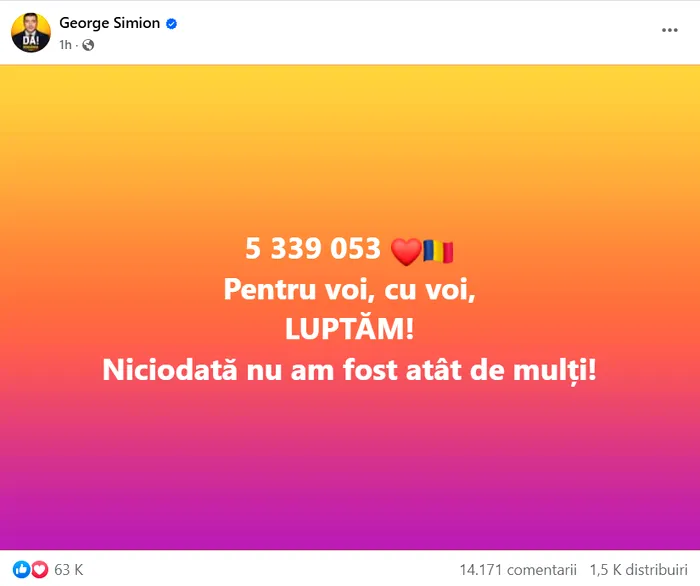 Niciodată nu am fost atât de mulți!”, a scris George Simion pe rețelele de socializare.