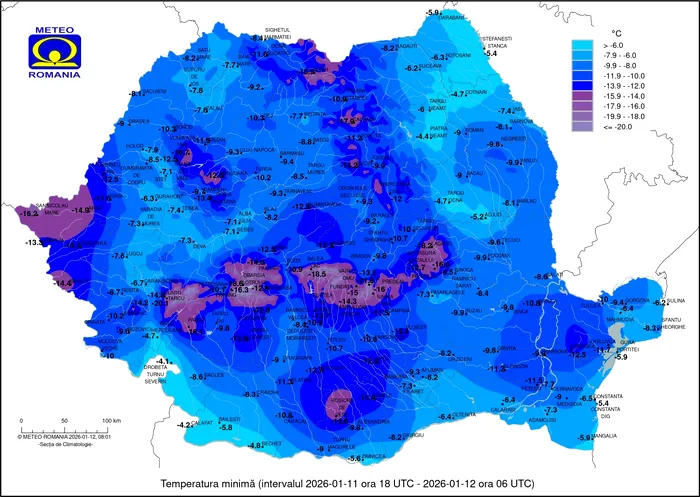 Cea mai scăzută temperatură din această dimineață a fost măsurată la Obârșia Lotrului, unde s-au înregistrat -19 grade. De asemenea, valori de -16 grade au fost consemnate la Sânnicolau Mare, Sinaia 1500 și Padeș. Gerul a afectat și zonele de câmpie și de deal. La Arad, Fundata și Roșiorii de Vede s-au înregistrat -15 grade, iar la Curtea de Argeș și Câmpulung Muscel temperaturile au coborât la -14 grade.