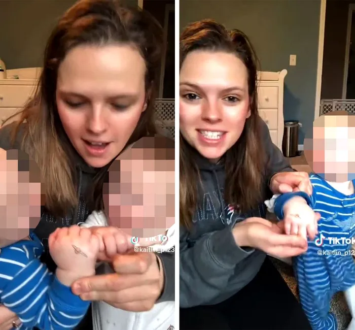 Astfel, într-un videoclip postat pe TikTok, ea apare ținând un pachet de modele, care includ o rață, un dinozaur și un câine. În cele din urmă, pentru primul bebeluș, a optat pentru o planetă. „Ești gata? O voi face chiar aici, pe fruntea ta. Ha, glumeam. O voi face pe mână”, spune ea. După ce l-a lipit, femeia s-a arătat încântată de „opera” sa: „Arată drăguț”.