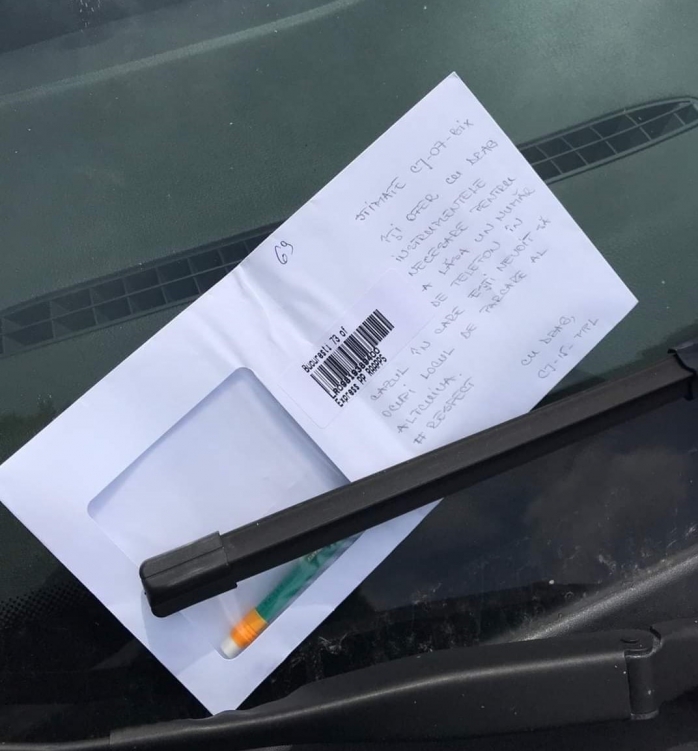 Șoferul a lăsat chiar și un mesaj foarte amabil pe plicul respectiv: „Stimate șofer, îți ofer cu drag instrumentele necesare pentru a lăsa un număr de telefon, în cazul în care ești nevoit să ocupi locul de parcare al altcuiva. Respect”, a scris clujeanul.