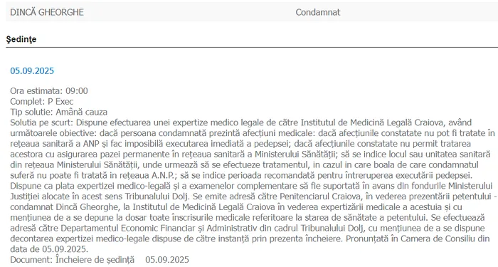 să se indice perioada recomandată pentru întreruperea executării pedepsei. Dispune ca plata expertizei medico-legală şi a examenelor complementare fie suportată în avans din fondurile Ministerului Justiţiei alocate în acest sens Tribunalului Dolj. Se emite adresă către Penitenciarul Craiova, în vederea prezentării petentuluicondamnat Dincă Gheorghe la Institutul de Medicină Legală Craiova, în vederea expertizării medicale a acestuia şi cu menţiunea de a se depune la dosar toate înscrisurile medicale referitoare la starea de sănătate a petentului” , se arată în decizia instanței.