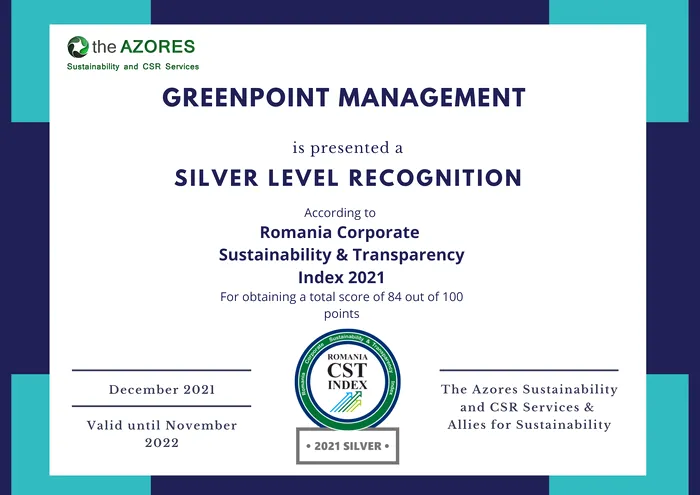 Raportul de Sustenabilitate al GreenPoint Management publicat recent, aferent anului 2020 este realizat după standardele internaționale GRI, iar GreenPoint Management publică din propria inițiativă un astfel de raport, fără a avea o obligație legală în acest sens. GreenPoint Management este prima și singura companie din domeniul său de activitate care este inclusă printre cele mai sustenabile companii la Romania CSR Index 2020 și CST Index 2021.