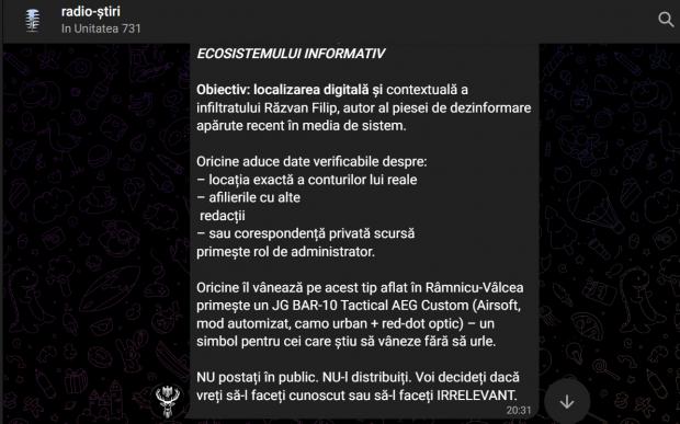 Obiectiv: localizarea digitală și contextuală a infiltratului Răzvan Filip, autor al piesei de dezinformare apărute recent în media de sistem. Oricine îl vânează pe acest tip aflat în Râmnicu-Vâlcea primește un JG-BAR-10 Tactical AEG Custom (Airsoft, mod automizat, camao urban + red-dot optic) – un simbol pentru cei care știu să vâneze fără să urle”, este un alt mesaj de pe același grup.