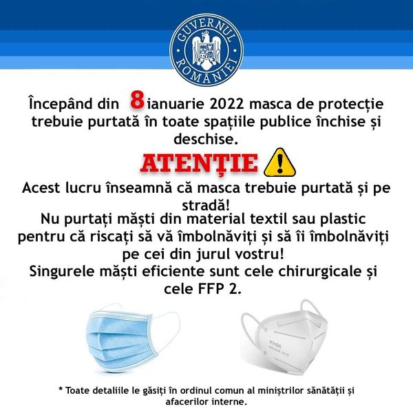 Cea mai importantă măsură vizează obligativitatea purtării măștii de protecție și în aer liber, nemaifiind permise măștile din pânză/textile sau plastic, ci doar cele de tip medical/chirirgical sau FFP2. Astfel, începând de sâmbătă, persoanele care merg într-un spațiu public purtând o mască textilă riscă să fie amendate cu până la 2500 de lei.