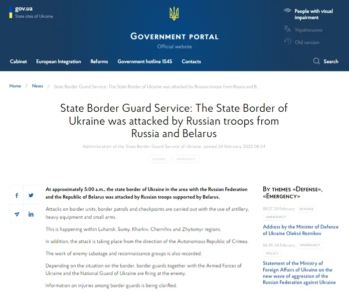”În jurul orei 5:00, granița de stat a Ucrainei în zona cu Federația Rusă și Republica Belarus a fost atacată de trupele ruse sprijinite de Belarus. Atacurile asupra unităților de frontieră, patrulelor de frontieră și punctelor de control sunt efectuate cu ajutorul artileriei, a echipamentului greu și a armelor de calibru mic”, se precizează în comunicat.