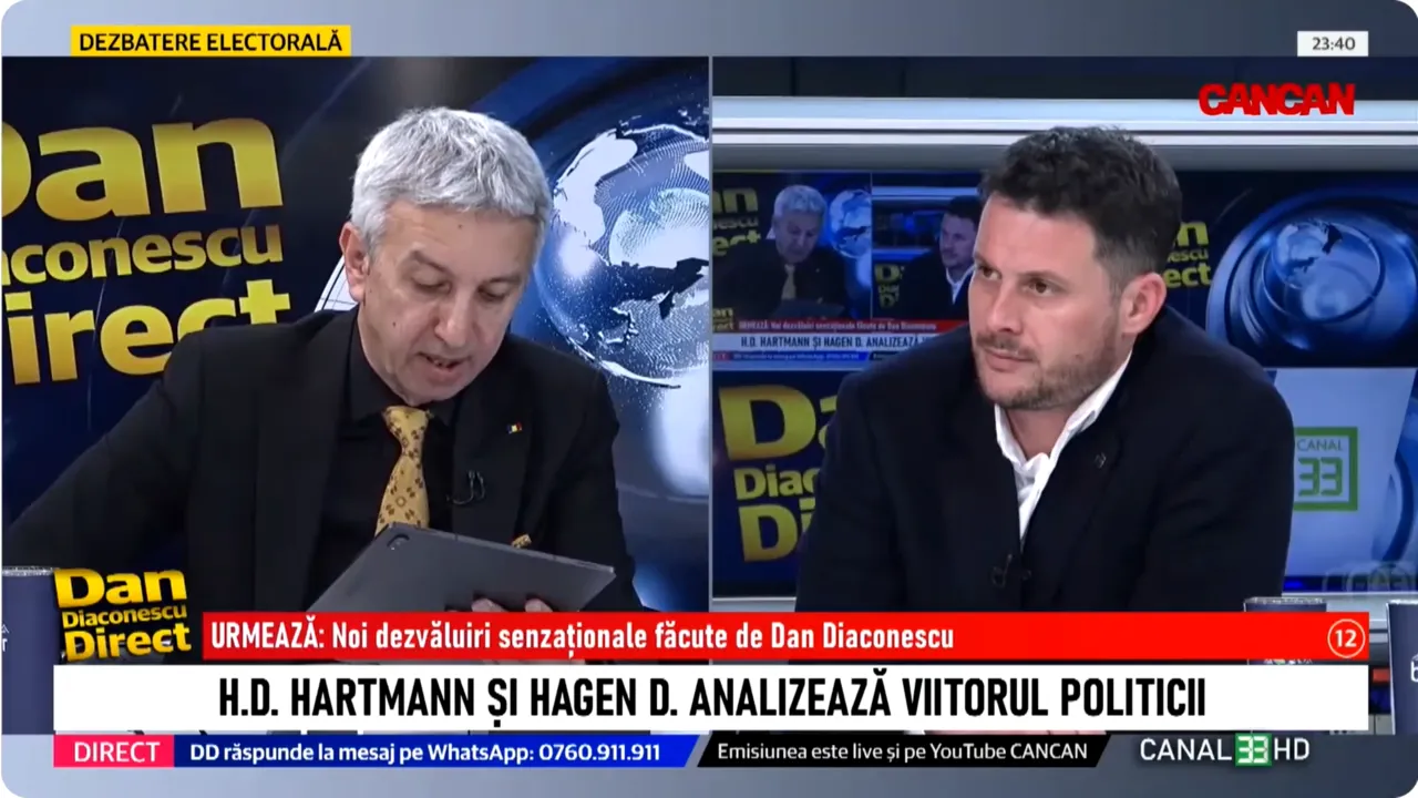 „Eu am participat activ tocmai ca să văd ce se întâmplă. Eu nu vorbesc din cărți, domnu’ Diaconescu. Ce am vorbit în această seară, să fie clar, sunt fapte reale. Chiar dacă am fost tranșant pe alocuri, sunt fapte reale.”, răspunde cu convingere Hagen D.
