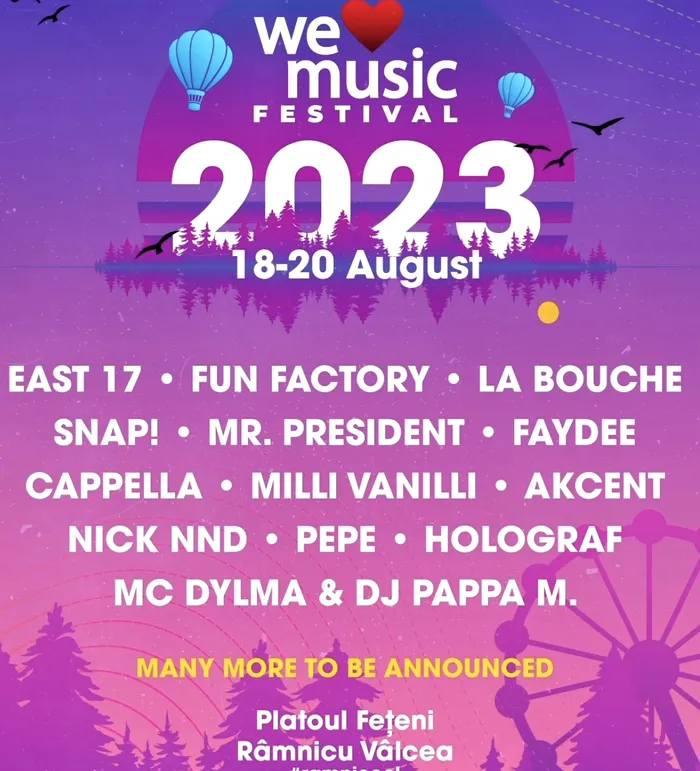 Vin în continuare vești bune pentru fanii muzicii bune, care se vor întâlni la vară la cea de-a doua ediție We Love Music Festival, eveniment care are loc la Platoul Fețeni din Râmnicu Vâlcea, în perioada 18-20 august 2023. Mulți artiști îndrăgiți vor urca pe scena festivalului, mai ales că Line-up-ul s-a îmbogățit cu nume mari ale muzicii naționale și internaționale.
