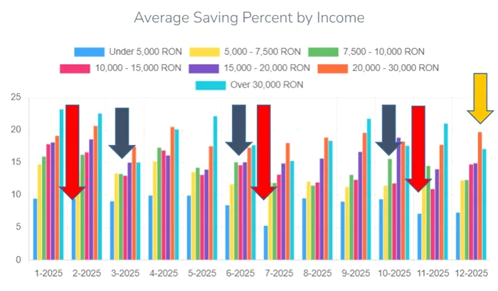 El avertizează că, pe măsură ce veniturile cresc, crește și tentația de a cheltui mai mult. Pentru salariile medii și medii-mari (5.000 – 15.000 lei), rata de economisire se menține relativ similară, însă suma economisită nu crește proporțional cu venitul.