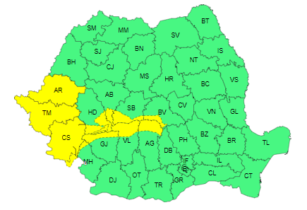 În Munții Banatului și în Carpații Meridionali va ploua și se vor acumula cantități de apă de 20…25 l/mp, iar izolat de peste 30 l/mp.