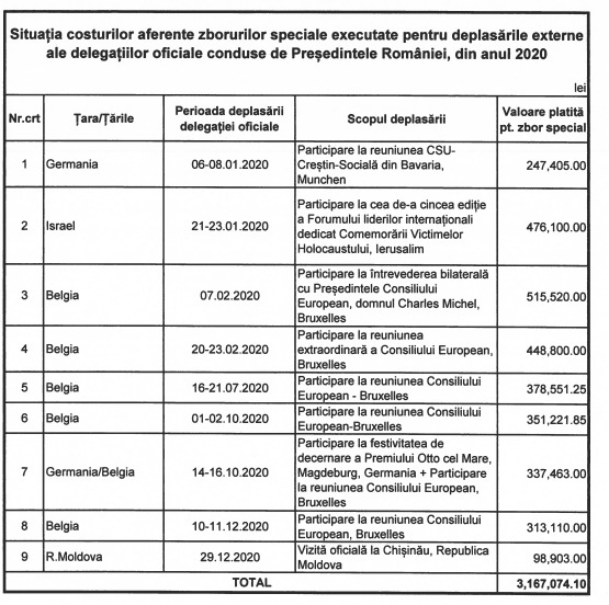 2020 a fost anul cu cele mai puține cheltuieli și deplasări din întreaga președinție a lui Klaus Iohannis. Fostul președinte a efectuat numai nouă zboruri în valoare de 3,1 milioane de lei. La restul întâlnirilor a participat în formatul online. Numai șase dintre acestea au fost efectuate către Belgia. Pe 29 decembrie 2020, echipa prezidențială a cheltuit 98.903 lei pentru o vizită de o zi în Republica Moldova. De asemenea, a cheltuit 378.551 lei pentru a primi Premiul Otto cel Mare la Magdeburg.