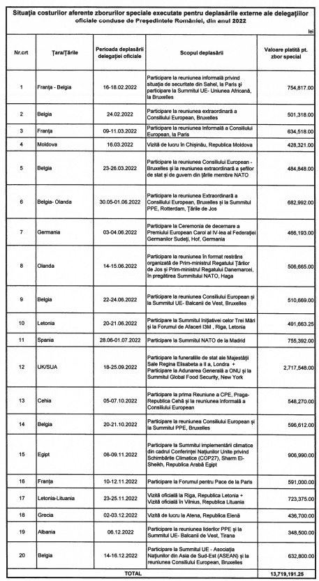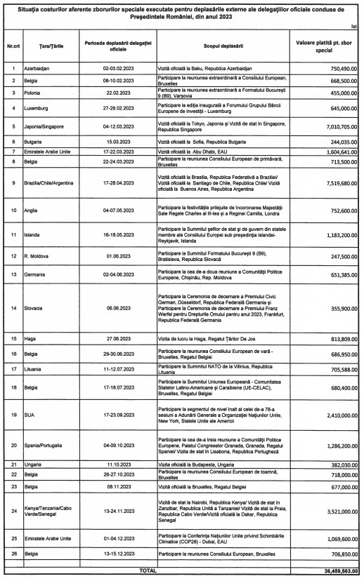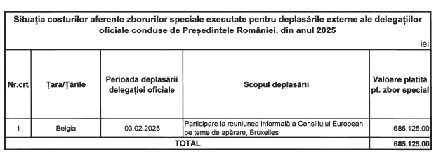 Ultima deplasare a fost efectuată pe 3 februarie 2025, în Belgia, cu un avion privat, și a costat 685.125 lei. Președintele a participat la o reuniune informală a Consiliului European pe teme de Apărare de la Bruxelles.