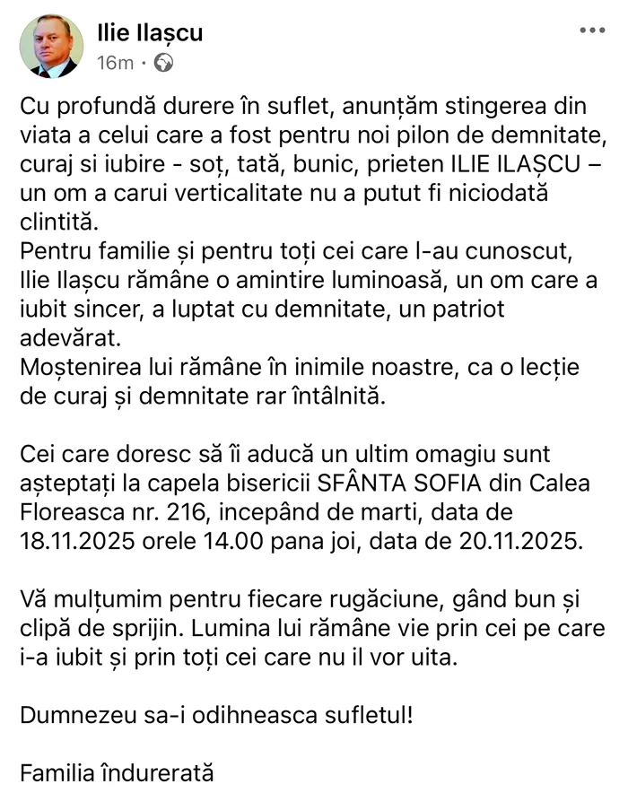 „Cu profundă durere în suflet, anunțăm stingerea din viață a celui care a fost pentru noi pilon de demnitate, curaj și iubire – soț, tată, bunic, prieten Ilie Ilașcu– un om a cărui verticalitate nu a putut fi niciodată clintită. Pentru familie și pentru toți cei care l-au cunoscut, Ilie Ilaşcu rămâne o amintire luminoasă, un om care a iubit sincer, a luptat cu demnitate, un patriot adevărat. Moștenirea lui rămâne în inimile noastre, ca o lecție de curaj și demnitate rar întâlnită. Vă mulțumim pentru fiecare rugăciune, gând bun și clipă de sprijin. Lumina lui rămâne vie prin cei pe care i-a iubit și prin toți cei care nu îl vor uita. Dumnezeu să-i odihnească sufletul”, se arată în mesajul postat pe Facebook.