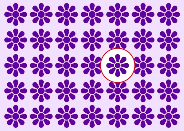 Care să fie, oare, floarea diferită de celelalte, în imaginea de mai sus? Trebuie să priviți cu atenție imaginea care prezintă 35 de flori mov. Una singură, însă, are o formă ușor diferită față de celelalte 34. Un asemenea test vizual are menirea de a induce privitorul în eroare, aspect care ar putea să se întâmple și în situația de față. La o privire atentă asupra imaginii, se poate observa că floarea diferită se află pe cel de-al treilea rând, coloana nr. 5. Unul dintre elementele care constituie planta mov are o dimensiune redusă, față de celelalte. Iată răspunsul mai jos, în articol!