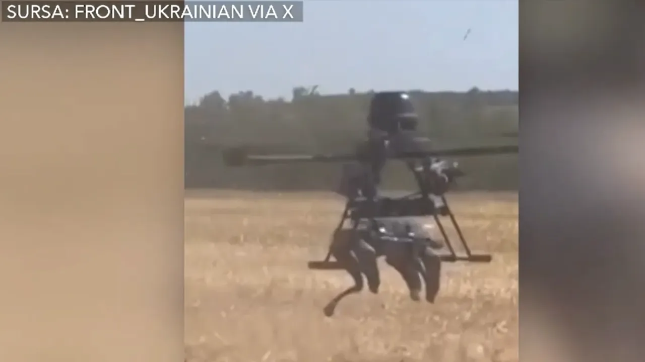 Au apărut noi imagini cu drona ucrainenilor ce transportă câini roboți pe linia frontului. Filmările arată drona în timp ce se ridică cu robotul la o înălțime mică, iar mai apoi aterizează pentru a-l lăsa pe pământ, înainte de a-și lua din nou zborul.
