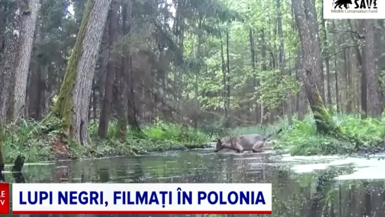 Îmagini rare într-o pădure din Polonia. Doi lupi negri au fost surprinși în timp ce traversau un pârâu împreună cu haita. Voluntarii ai unei Asociații de Conservare a Vieții Sălbatice au instalat o camera de supraveghere ca să studieze comportamentul castorilor.