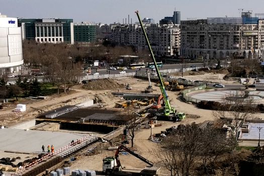 Practic, toată piața este ocupată de utilaje de construcții și se poate observa foarte clar cum a fost sistematizată circulația, astfel încât să nu încurce șantierul.