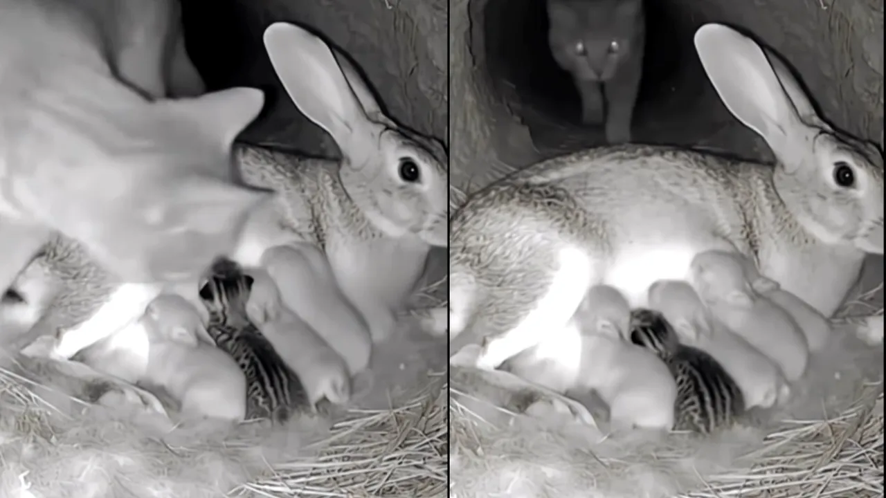 Imaginile serii cu misiunea de „salvare” a unui pui de pisică de la sânul unei iepuroaice. Vezi imagini absolut adorabile cu puiul de pisică care se integrează perfect printre „frații” săi iepurași. Toți se află la „masă”, când pisica vine și își recuperează puiul „infiltrat” printre micii iepurași.
