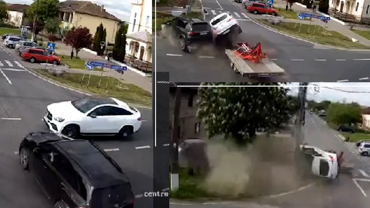 Momentul în care un șofer a zburat cu Mercedesul peste un sens giratoriu și alte două mașini. Ce s-a întâmplat