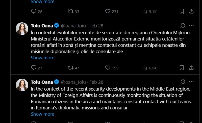 „Situaţia rămâne fluidă şi spaţiile aeriene sunt închise pentru mai multe state din regiune pe fondul atacurilor cu drone şi rachete. Celula de criză a MAE funcţionează în regim permanent. Împreună cu colegii din oficiile consulare ţinem legătura cu cetăţenii români aflaţi pe spaţiile afectate care şi-au anunţat prezenţa sau au solicitat informaţii sau asistenţă consulară. Totodată, suntem în legătură cu autorităţile statelor din regiune şi retelele consulare ale statelor membre ale UE pentru eventuale operaţiuni de repatriere când condiţiile de securitate o să permită acest lucru în siguranţă. Doamna Ministru Oana Ţoiu urmează să participe la o reuniune extraordinară a Consiliului de Afaceri Externe”, a transmis MAE.