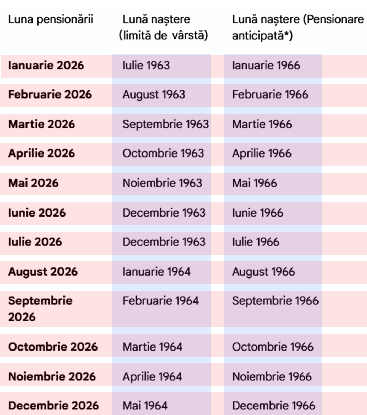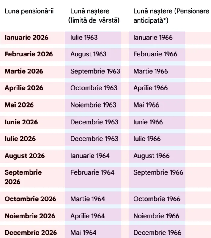 Astfel, în luna ianurie 2026, poate ieși la pensie de vârstă o femeie născută în iulie 1963, iar la pensie anticipată poate ieși la pensie o femeie născută în ianuarie 1966.