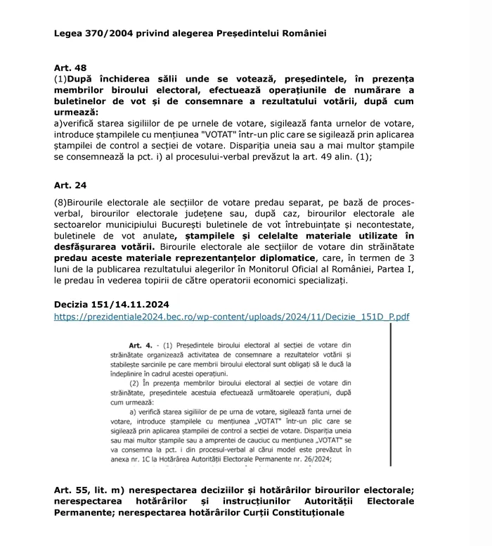În cuprinsul Anexei 5 a Hotărârii Autorității Electorale Permanente nr. 29/2016 pentru aprobarea modelelor ștampilelor electorale care vor fi folosite la alegerile pentru Senat și Camera Deputaților este prevăzut modelul ștampilei cu mențiunea „VOTAT” care va fi folosit la alegerea Senatului și a Camerei Deputaților, în conformitate art. 6 alin. 5 lit. e) din Decizia BEC nr. 260/D/21.11.2024 privind organizarea activității de consemnare, verificare și centralizare a rezultatelor alegerilor pentru Senat și Camera Deputaților din anul 2024, „ în cazul votului exercitat la secția de votare din țară sau din străinătate, sunt considerate nule și nu intră în calculul voturilor valabil exprimate buletinele de vot pe care a fost aplicată o ștampilă cu mențiunea „VOTAT” care are alt model decât cel legal aprobat. ”