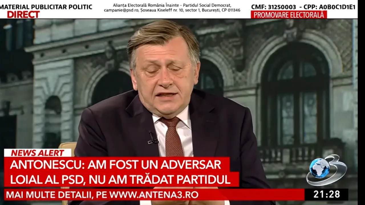 „Pesediștii mai în vârstă știu că am fost un adversar loial. Când am fost adversar am fost adversar și când am fost aliat am fost aliat. Eu n-am trădat niciodată PSD-ul atunci când am avut o înțelegere”, a declarat Crin Antonescu la Antena 3 CNN.