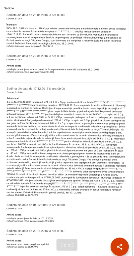 Am fost chemată la cabinetul ministrului de la acea vreme (septembrie 2010) și apostrofată că de ce îmi permit să aprob penalitati pe un contract al însuși MAI. Am explicat că nerespectarea prevederilor legale în materia achizițiilor publice era evidentă, iar verificarea a fost făcută de o echipă de control din care eu personal nu făcusem parte, dar am aprobat raportul pentru că am verificat și eu dosarul achiziției în procedura specifică pentru rambursarea cheltuielilor. (…).