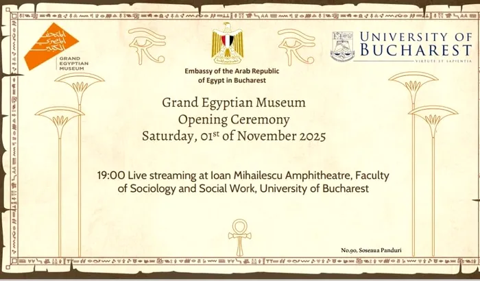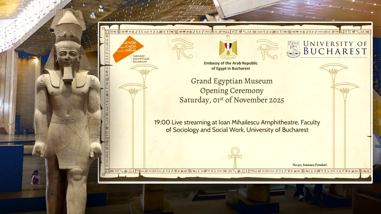 Inaugurarea Marelui Muzeu din Egipt (GEM) nu a rămas fără ecou în România. Dimpotrivă, Egiptul vine la București! Universitatea din București, alături de Ambasada Egiptului la București, adresează o invitație inedită de a lua parte la un eveniment istoric, precum ceremonia de deschidere a Marelui Muzeu Egiptean. Transmisiunea va începe sâmbără, 1 noiembrie, de la ora 19.00.