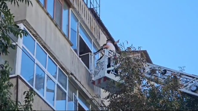 Cu ajutorul autospecialei pentru intervenție la înălțime, au fost evacuați de la etajul 3, un sugar în vârstă de 9 luni și tatăl acestuia, casa scării fiind inundată cu fum.