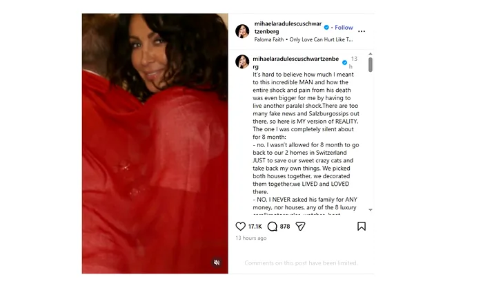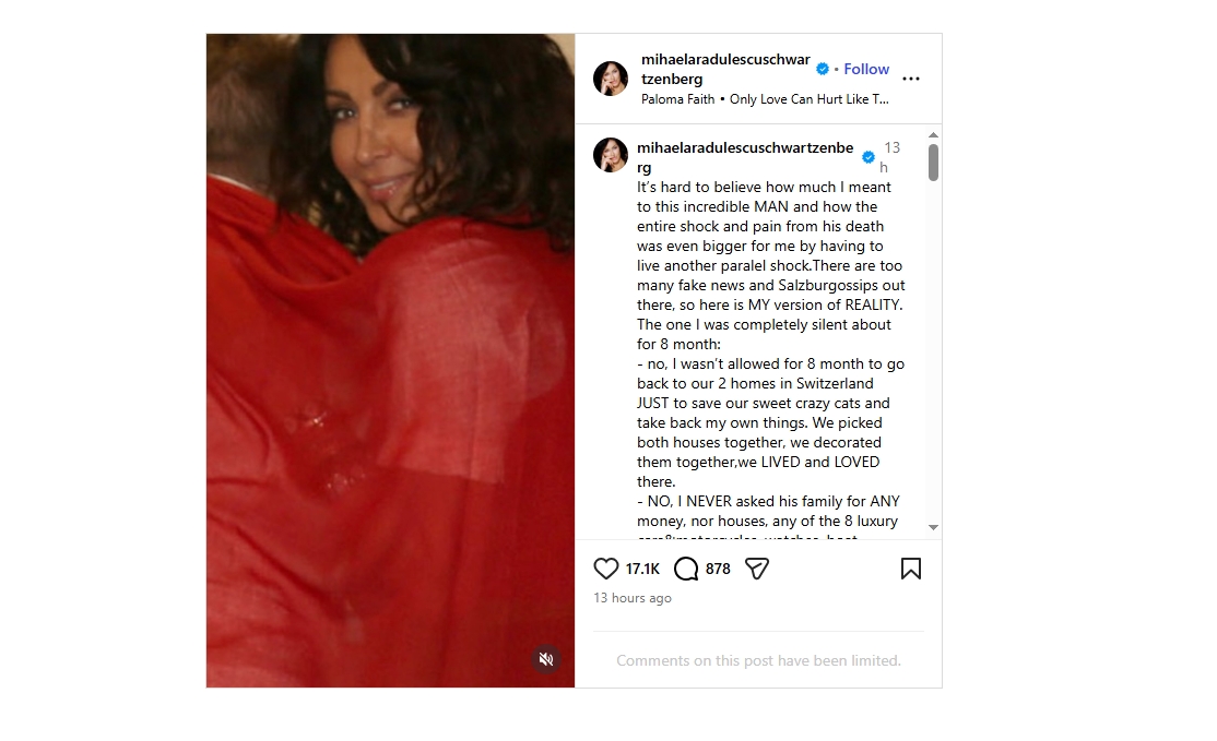 ”Este greu de crezut cât de mult am însemnat pentru acest OM incredibil și cum șocul și durerea de la moartea lui au fost cu atât mai mari pentru mine, fiind nevoită să trăiesc încă un șoc paralel. Sunt prea multe știri false despre Salzburg, așa că iată varianta MEA de REALITATE. Cea despre care am tăcut complet timp de 8 luni: