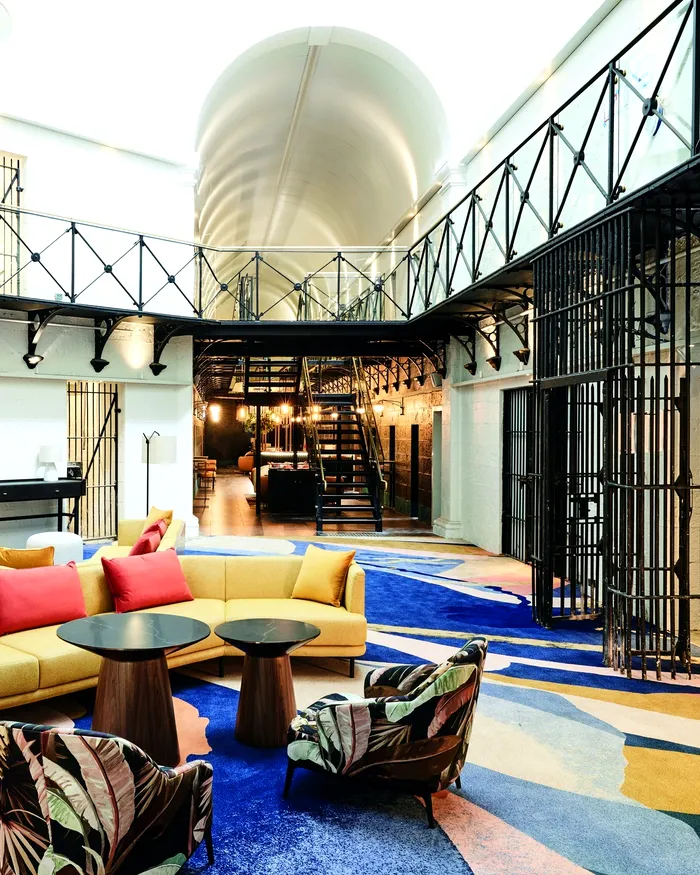 Hotelul atrage atenția prin atriumul luminos, curtea de exerciții transformată în spațiu verde și celulele păstrate în restaurant.