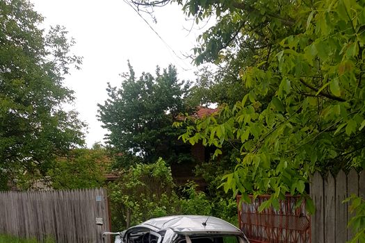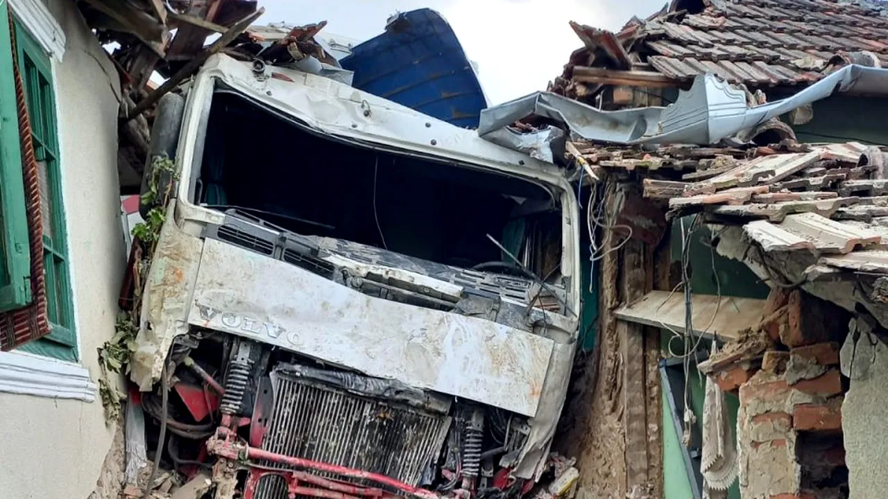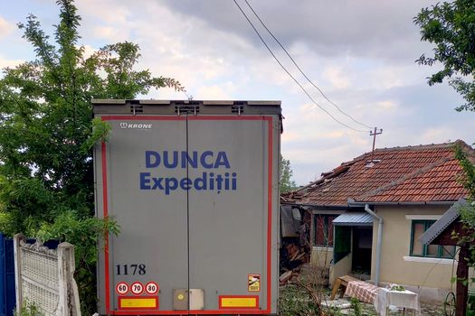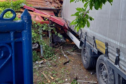 Conducătorul autotrenului nu a reușit să frâneze și a intrat în curtea unui localnic. A lovit un autoturism, apoi tirul s-a oprit între două case, iar pe una a avariat-o.