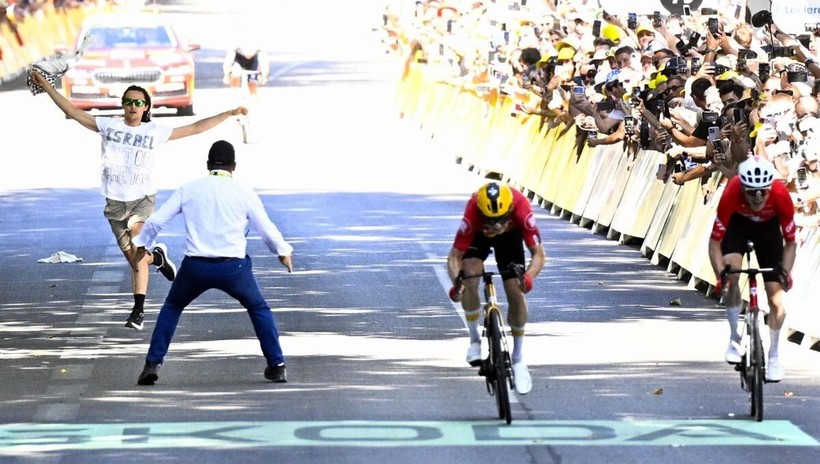 Un militar pro Palestina a pătruns pe șosea la Turul Franței, în timp ce sportivii ajungeau la linia de sosire. Protestatarul a fost oprit cu un placaj spectaculos de către unul dintre organizatori, apoi a fost reținut.