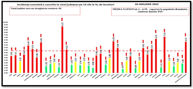 Incidența infectărilor cumulate la 14 zile, raportate la 1.000 de locuitori – calculat de către Direcțiile de Sănătate Publică, la nivelul Municipiului București și al județelor – a ajuns, marți, la 4,35 la mia de locuitori.