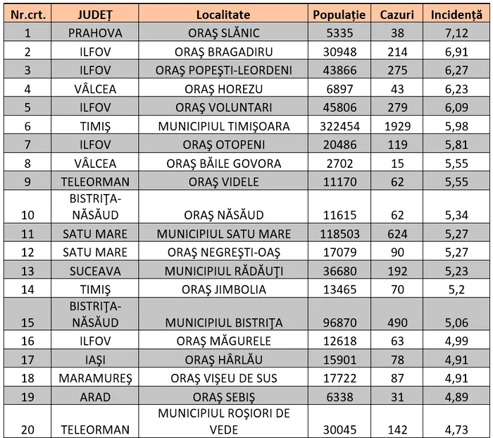 Topul municipiilor și al zonelor urbane cu incidențe ridicate: