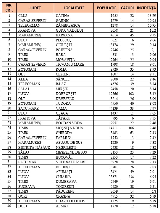 În total, sunt 414 localități din România cu incidențe mai mari de 3 ‰.